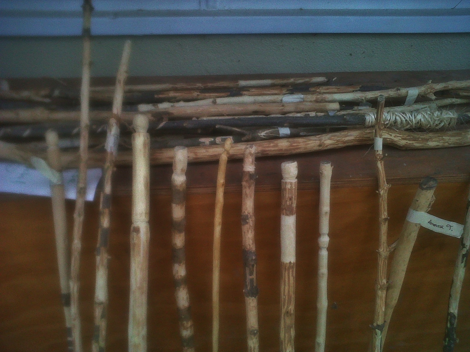 I sit the students in a circle and talk about tool safety. I am a little graphic with the students about slicing fingers, so they are safe and careful. I do a demonstration and then I give them soft wood and hard wood to practice for one or two classes. Once they show me their technique, I let them choose a walking stick out of the sticks we have harvested. They work at their own pace, and those who finish early (and do a fine job) are allowed to start other whittling projects, perhaps with bone. They love to chat, so sometimes I will tell them a little story which does not require much focus, or we will all work quietly for a while. On nice days we work out in the garden, and sometimes roast some nuts in the oven. On stormy days we work in the class and just sweep up the floor afterwards. At the end of class the students put a name tag of their evolving walking sticks, we bundle them up and store them outside on the cool, shady side of the classroom so they don’t dry out too quickly.